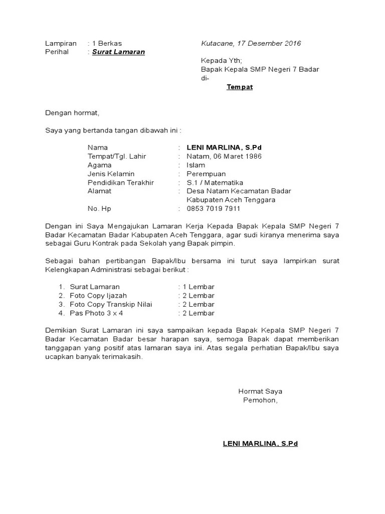 Sebelum berhasil menjadi seorang guru, tentunya kamu perlu menyiapkan surat lamaran kerja guru yang menarik dan profesional. Berikut ini bisa anda download contoh surat lamaran kerja guru smp baik negeri maupun swasta bentuk doc dan pdf. 1 kriteria surat lamaran kerja guru . The modifmobilz.com team also provides the picture in high quality resolution (hd image resolution) that may be downloaded by simply way. Contoh surat lamaran kerja guru. Surat lamaran pekerjaan jenis ini memiliki perbedaan pada bagian tujuan posisi yang dilamar. Baik dari guru tk, sd, smp, sma, honorer, dan lain sebagainya. 15 contoh surat lamaran kerja guru paling lengkap . Contoh surat lamaran kerja guru agama | ben jobs cv format for job, creative cv. Contoh surat lamaran kerja guru adalah surat yang digunakan untuk melamar pekerjaan dalam instansi pendidikan untuk menjadi pengajar. Nah, jika kamu ingin melamar menjadi pengajar di smp, pastikan dulu lowongan yang dibuka sesuai dengan spesifikasi pendidikan terakhir kamu.